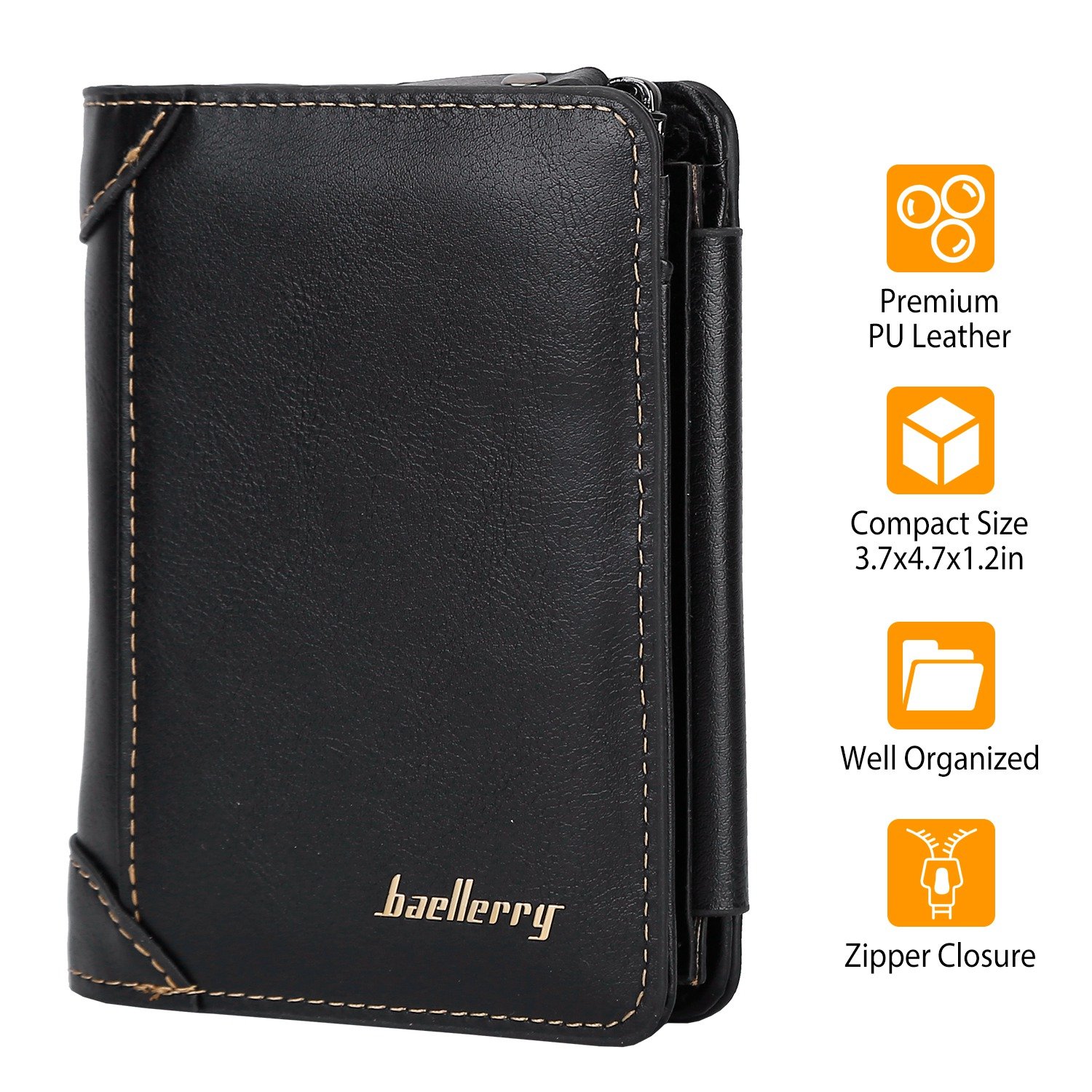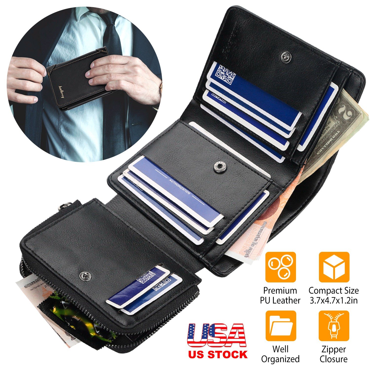 Men’s Leather Wallet ID Card Holder Purse Trifold Clutch Money Zipper with ID Window 14 Credit Card 1 ID Card