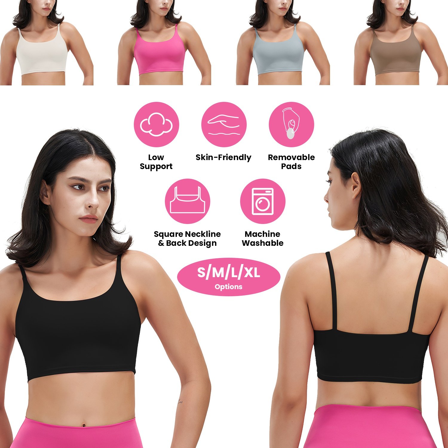 Home > Women Strap Sport Bras Padded Strappy Crop Square Neck Low Impact Bras Sexy Fitness Tank Tops with Removable Pads Flat Straps for Gym Yoga Workout Run