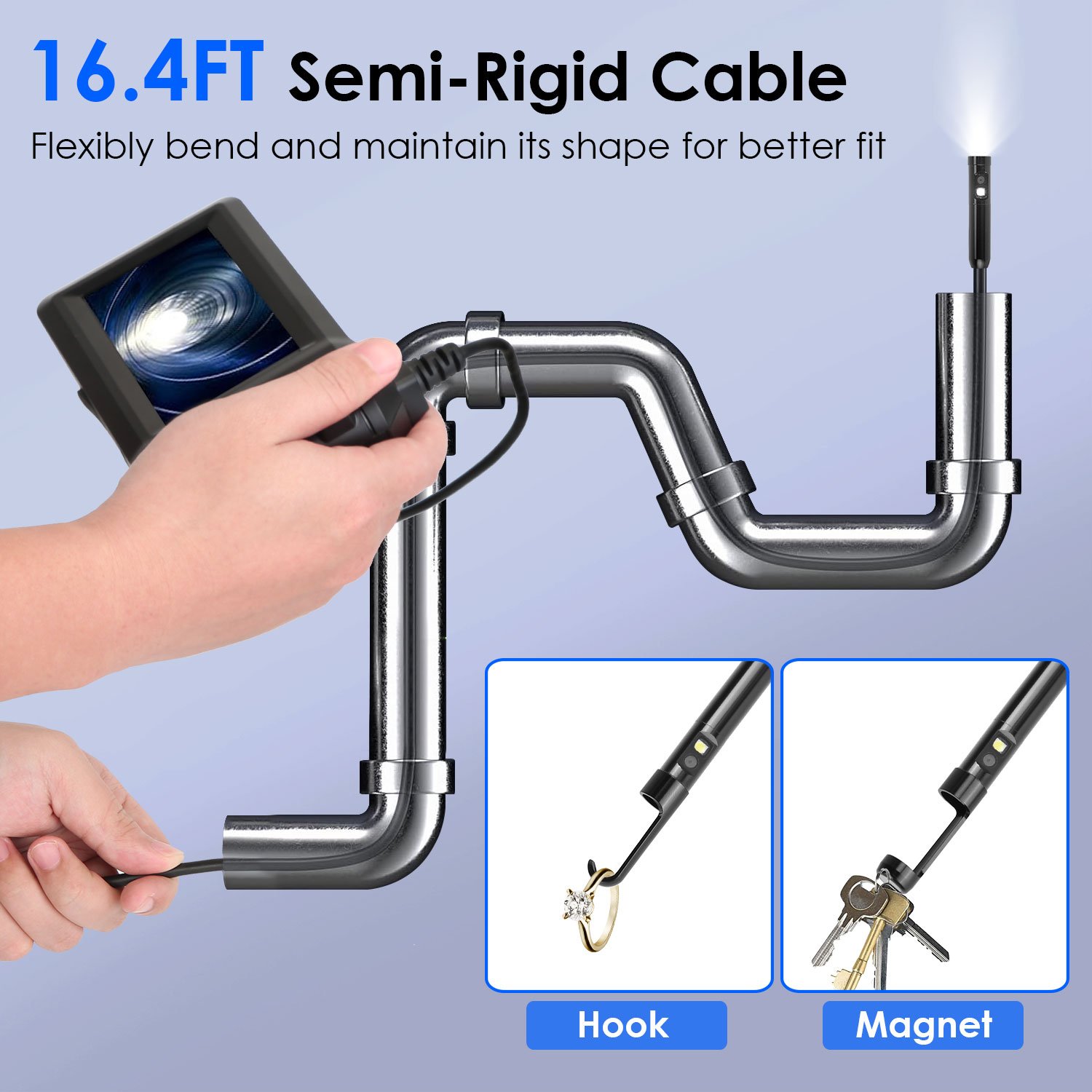 Home > 1080P Dual Lens Endoscope Camera with 8 LED Light 8mm Borescope Inspection Camera 4.3” Colorful Screen IP67 Waterproof 16.4FT Semi-Rigid Cord Handheld