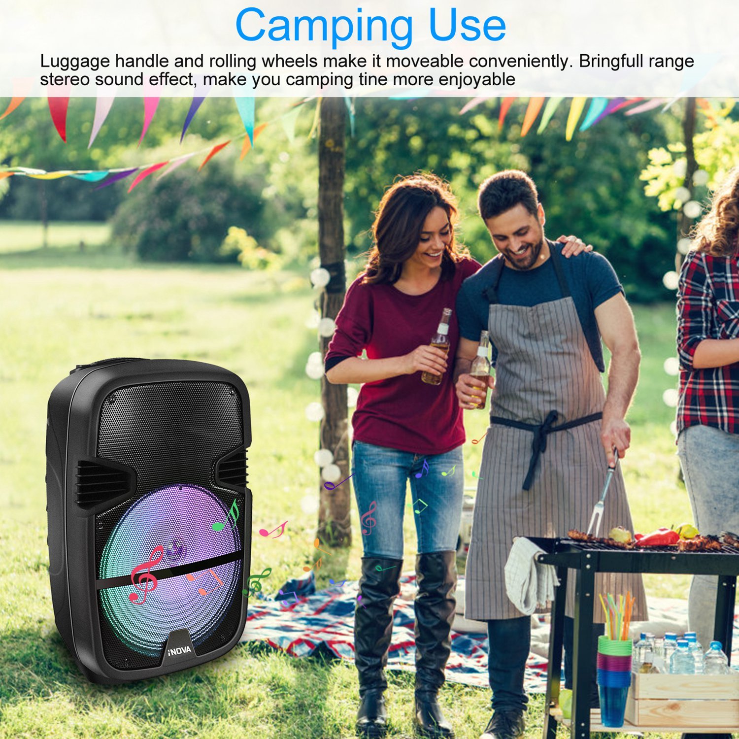 KOCASO Wireless Speaker Portable PA Karaoke System with 12" Subwoofer FM Radio Wired Microphone w/ DJ Lights FM Remote Control