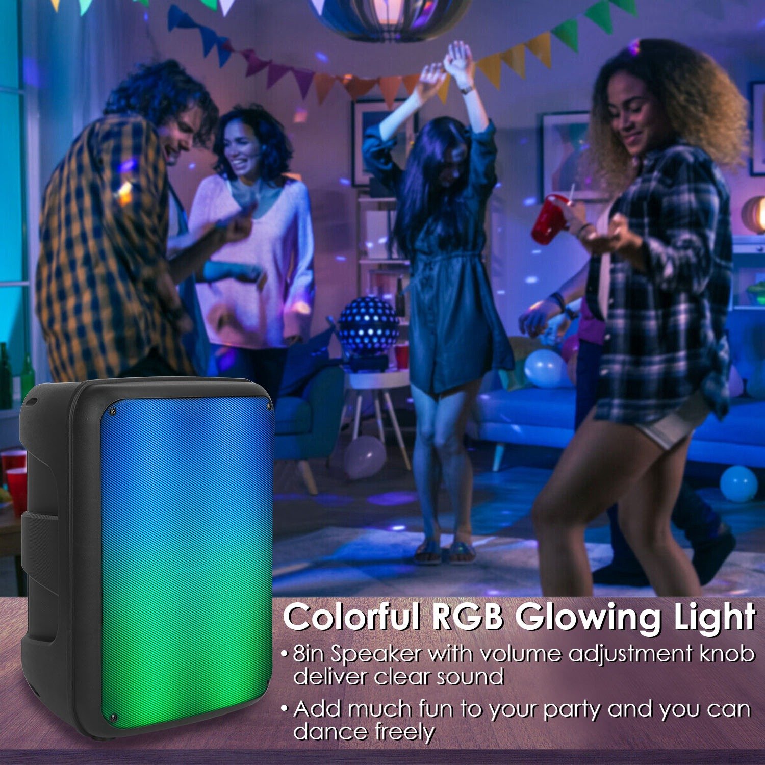 Portable Wireless Party Speaker 8in Colorful Lights DJ PA System with TWS Function FM Radio USB MMC Card Reading Aux In Recording Function Mic