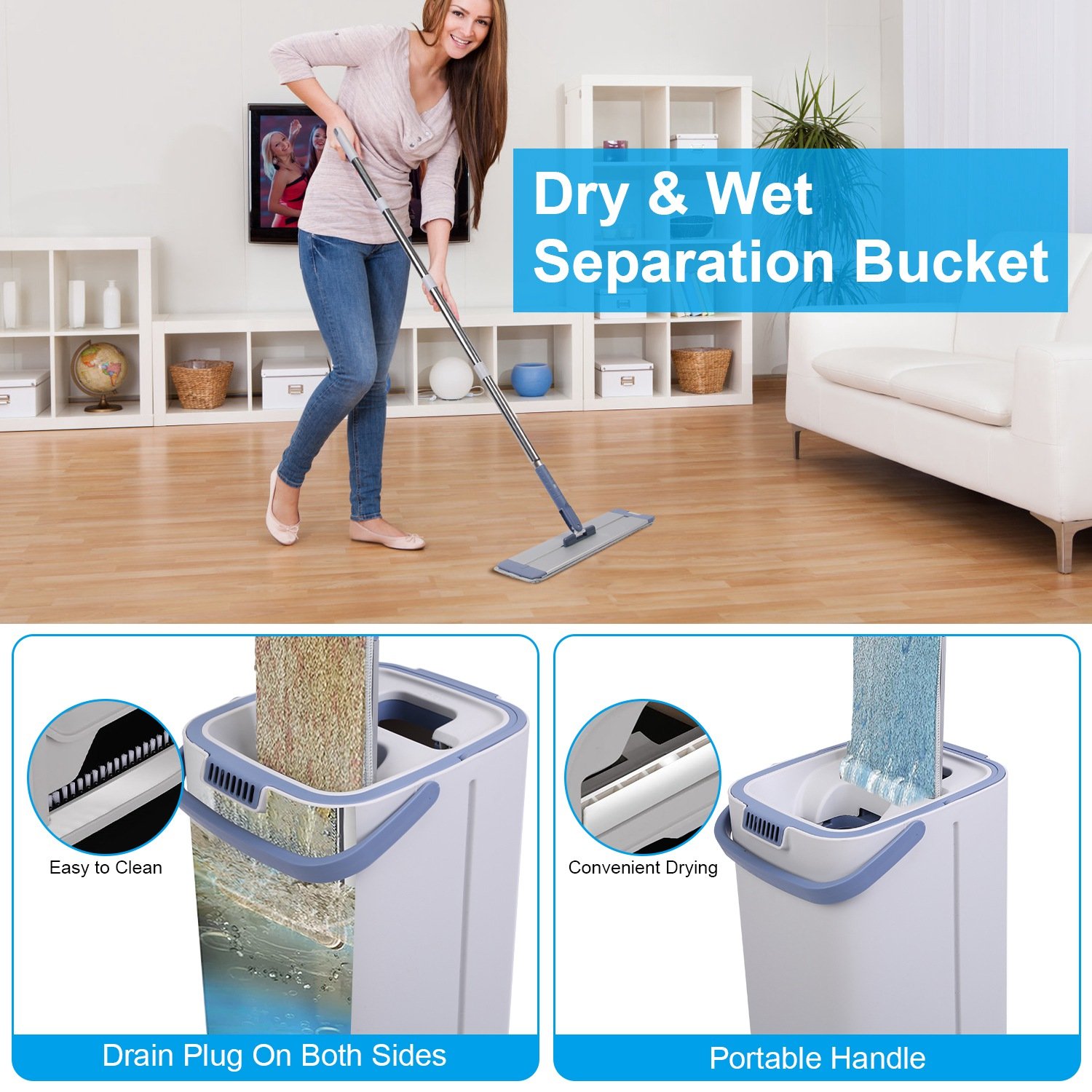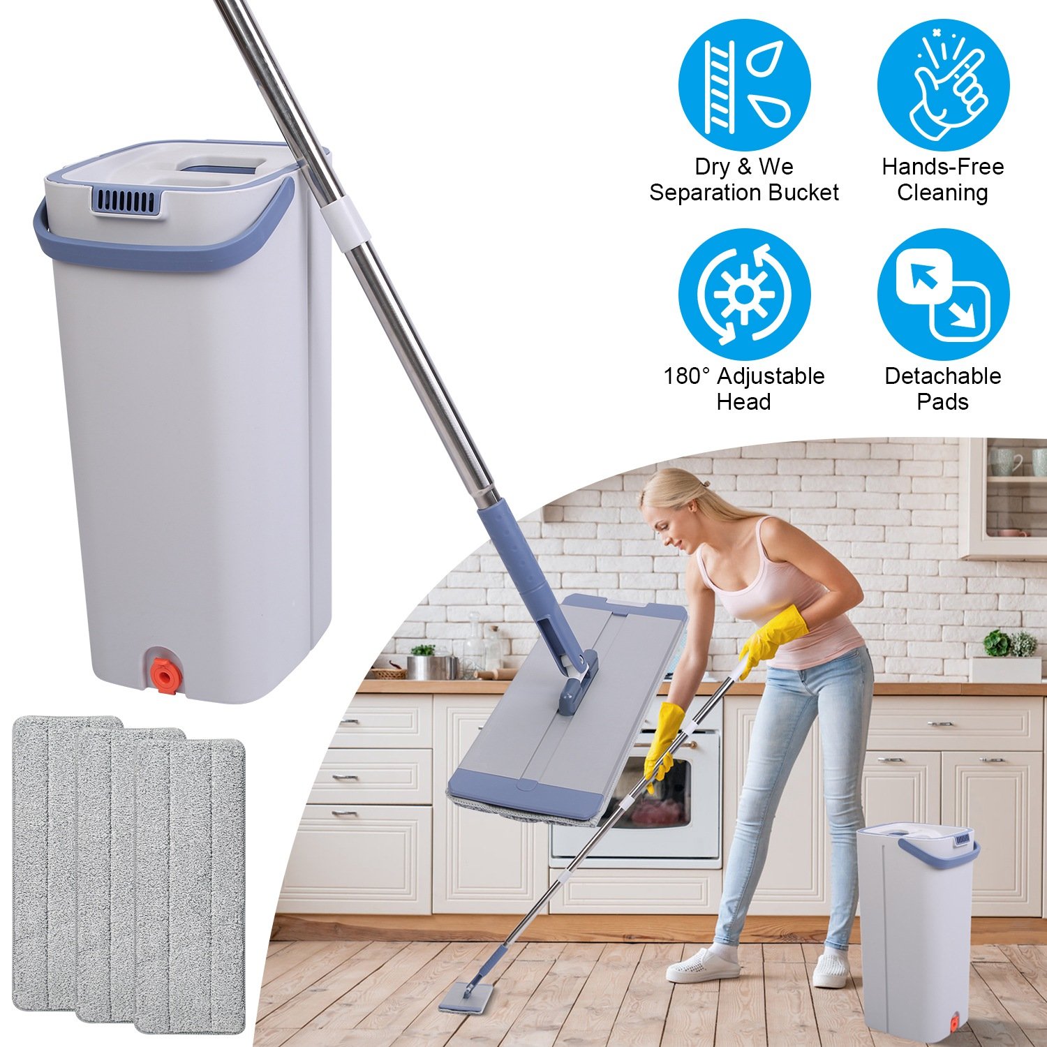 Home > Mop Bucket with Wringer Set Flat Floor Mop Clean and Dry Separate Bucket 3 Replaceable Pads Hands Free Home Floor Cleaning Mop Reusable Washable Mop P
