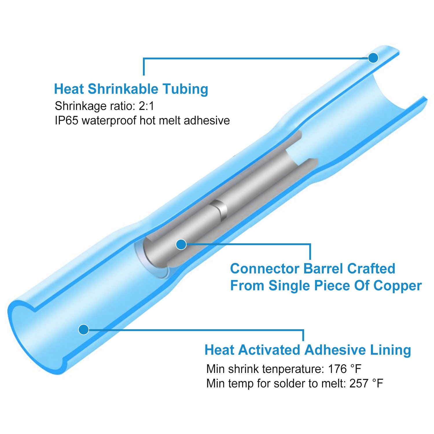 Blue Shrink Connectors: Diameter of Copper Pipe: 2.26mm, Inner Diameter of Heat Shrink Tube: 5.67mm, Cable Cross-section: 1.5-2.5 mm²(A.W.G:16-14)