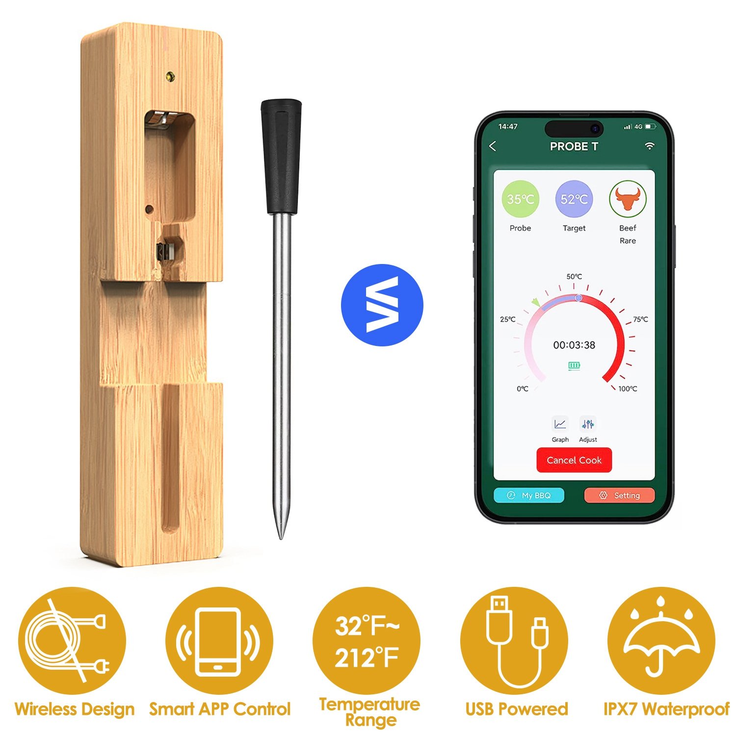 Material: 304 Stainless Steel Probe+Bamboo Charging Dock