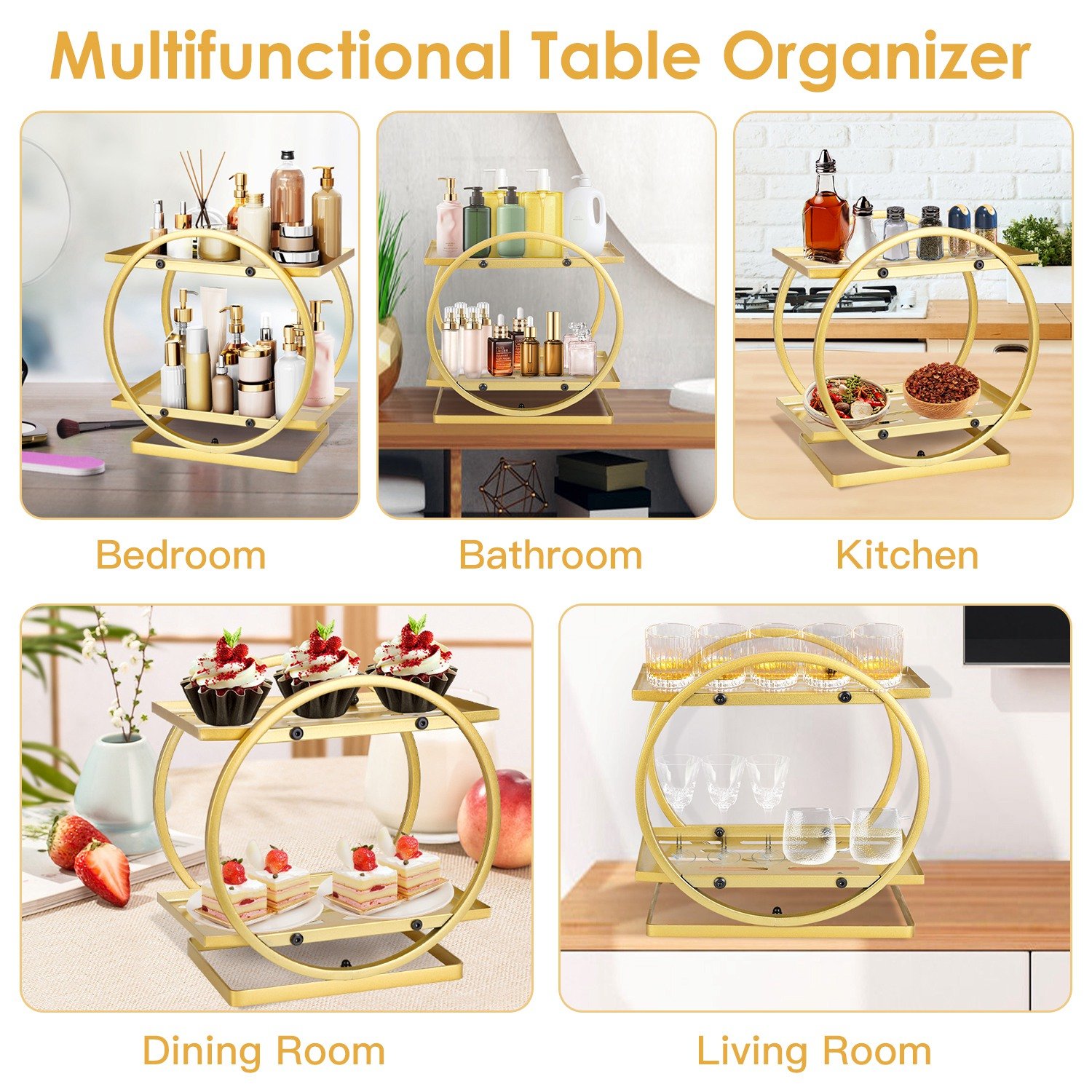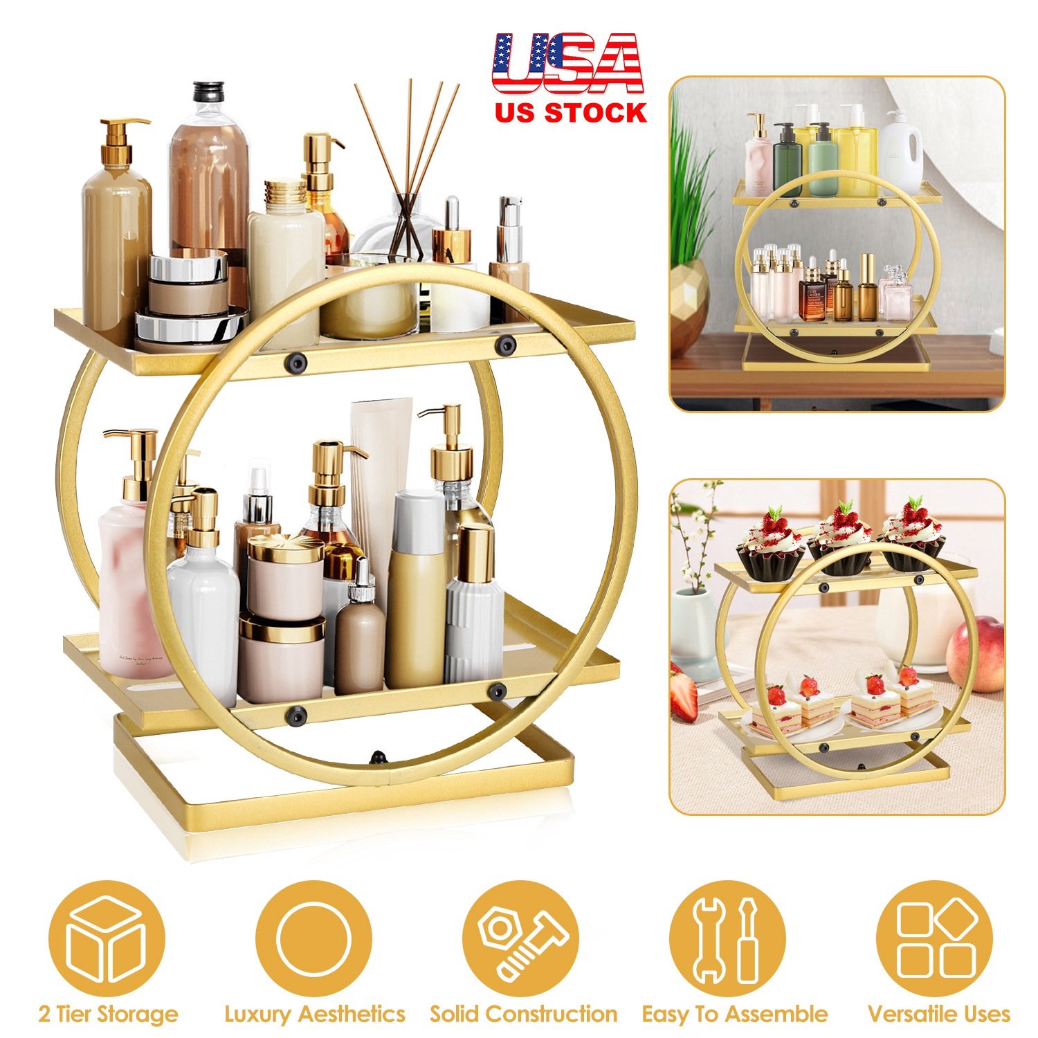 Home > 2 Tier Makeup Organizer for Vanity Gold Perfume Organizer for Dresser Carbon Steel Kitchen Bathroom Countertop Organizer Cosmetic Display Trays Servin