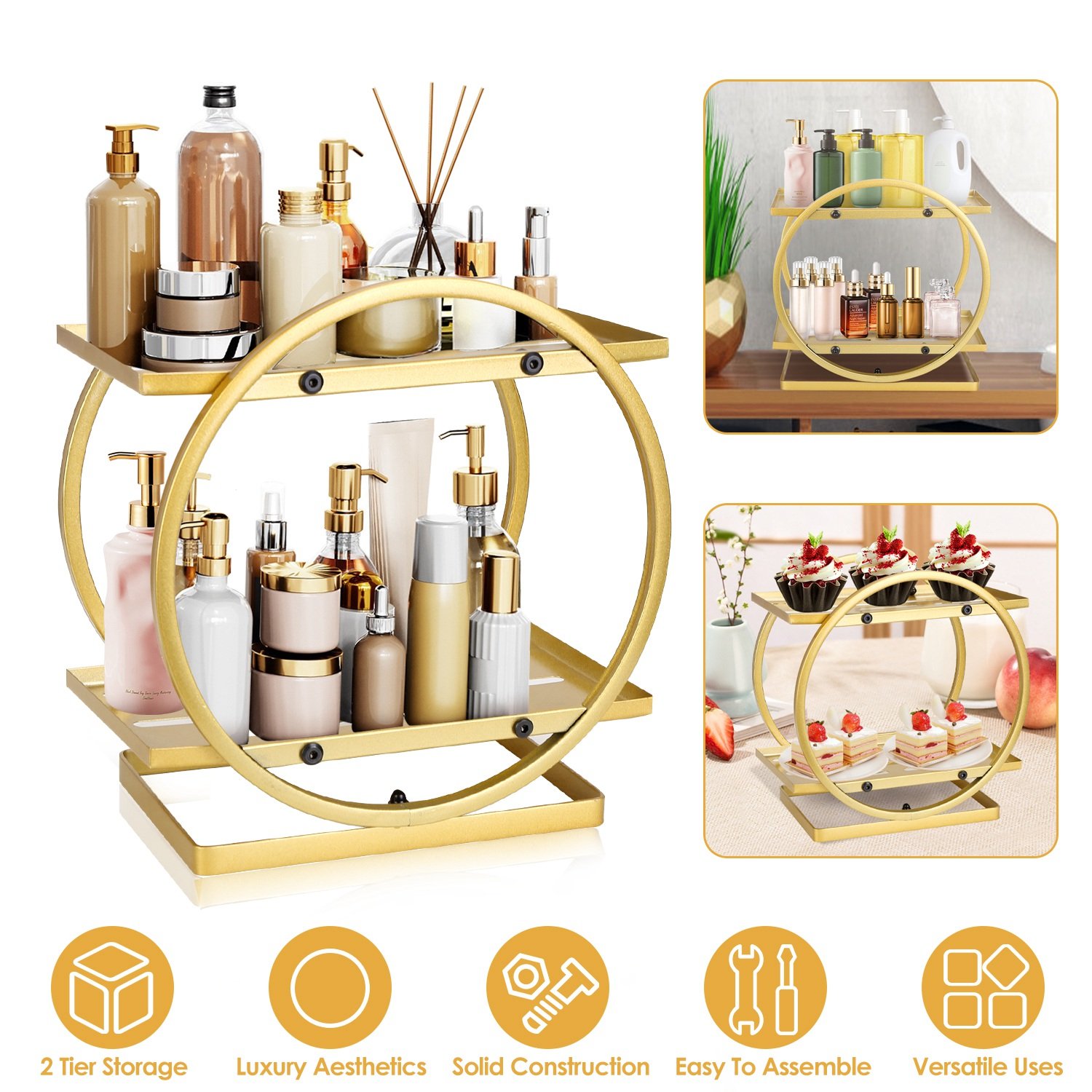 2 Tier Makeup Organizer for Vanity Gold Perfume Organizer for Dresser Carbon Steel Kitchen Bathroom Countertop Organizer Cosmetic Display Trays Servin